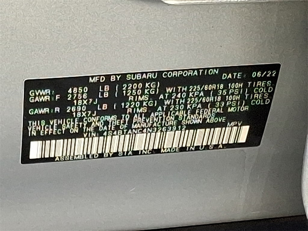Certified. *SUBARU CERTIFIED*, *NAVIGATION*, *BLUETOOTH*, *HEATED SEATS*, *LEATHER*, *SUNROOF*, *USB*, *SATELLITE RADIO*, *BACK UP CAMERA*, *BLIND SPOT MONITOR*. Check out all these great options Popular Package #2 (All-Weather Floor Liners, Auto-Dimming Exterior Mirror w/Approach Light, Dome Light LED Upgrade, Rear Bumper Cover, Rear Seat Back Protector, and Splash Guards), Power Moonroof & HSW & Navigation System (DriverFocus (Driver Monitoring System), Heated Steering Wheel, Power Moonroof, and Radio: Subaru STARLINK 11.6" Multimedia Nav System), Subaru Certified Pre-Owned Certified, 12 Speakers, 3.90 Axle Ratio, 4-Wheel Disc Brakes, ABS brakes, Air Conditioning, Alloy wheels, AM/FM radio: SiriusXM, Auto High-beam Headlights, Auto-dimming Rear-View mirror, Automatic temperature control, Brake assist, Bumpers: body-color, Compass, Driver door bin, Driver vanity mirror, Dual front impact airbags, Dual front side impact airbags, Electronic Stability Control, Emergency communication system: STARLINK Safety and Security (Subscription Required), Exterior Parking Camera Rear, Four wheel independent suspension, Front anti-roll bar, Front Bucket Seats, Front Center Armrest w/Storage, Front dual zone A/C, Front fog lights, Front reading lights, Fully automatic headlights, Garage door transmitter: HomeLink, harman/kardon® Speakers, Heated door mirrors, Heated Front Bucket Seats, Heated front seats, Heated rear seats, Illuminated entry, Knee airbag, Leather steering wheel, Low tire pressure warning, Memory seat, Occupant sensing airbag, Outside temperature display, Overhead airbag, Overhead console, Panic alarm, Passenger door bin, Passenger vanity mirror, Perforated Leather-Trimmed Upholstery, Power door mirrors, Power driver seat, Power Liftgate, Power passenger seat, Power steering, Power windows, Radio: Subaru STARLINK 11.6" Multimedia Plus Sys, Rear anti-roll bar, Rear seat center armrest, Rear window defroster, Rear window wiper, Remote keyless entry, Roof rack, Security system, Speed control, Speed-sensing steering, Split folding rear seat, Spoiler, STARLINK/Apple CarPlay/Android Auto, Steering wheel mounted audio controls, Steering Wheel Paddle Shift Control Switches, Tachometer, Telescoping steering wheel, Tilt steering wheel, Traction control, Trip computer, Turn signal indicator mirrors, Variably intermittent wipers, and Wheels: 18" x 7J Black Aluminum Alloy.