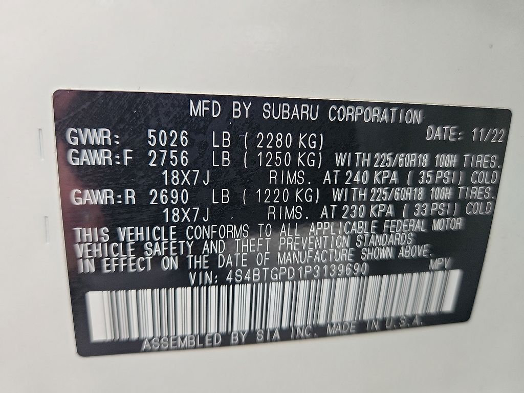 Certified. *SUBARU CERTIFIED*, *NAVIGATION*, *BLUETOOTH*, *HEATED SEATS*, *LEATHER*, *SUNROOF*, *USB*, *SATELLITE RADIO*, *BACK UP CAMERA*, *BLIND SPOT MONITOR*. Check out all these great options Standard Model, Subaru Certified Pre-Owned Certified, 12 Speakers, 4-Wheel Disc Brakes, 4.111 Axle Ratio, ABS brakes, Air Conditioning, All-Weather Floor Liners, Alloy wheels, AM/FM radio: SiriusXM, Auto High-beam Headlights, Auto-Dimming Exterior Mirror w/Approach Light, Auto-dimming Rear-View mirror, Automatic temperature control, Brake assist, Bumpers: body-color, Compass, Crystal White Pearl Body Side Molding, Driver door bin, Driver vanity mirror, Dual front impact airbags, Dual front side impact airbags, Electronic Stability Control, Emergency communication system: STARLINK Safety Plus (3-year free trial), Exterior Parking Camera Rear, Four wheel independent suspension, Front anti-roll bar, Front Bucket Seats, Front Center Armrest w/Storage, Front dual zone A/C, Front fog lights, Front reading lights, Fully automatic headlights, Garage door transmitter: HomeLink, harman/kardon® Speakers, Heated & Ventilated Front Bucket Seats, Heated door mirrors, Heated front seats, Heated rear seats, Heated steering wheel, HVAC memory, Illuminated entry, Knee airbag, Leather Shift Knob, Leather steering wheel, Low tire pressure warning, Memory seat, Navigation System, Occupant sensing airbag, Outside temperature display, Overhead airbag, Overhead console, Panic alarm, Passenger door bin, Passenger vanity mirror, Perforated Nappa Leather-Trimmed Upholstery, Power door mirrors, Power driver seat, Power Liftgate, Power moonroof, Power passenger seat, Power steering, Power windows, Radio: Subaru STARLINK 11.6" Multimedia Nav System, Rear anti-roll bar, Rear Bumper Cover, Rear seat center armrest, Rear window defroster, Rear window wiper, Remote CD player, Remote keyless entry, Roof rack, Security system, Speed control, Speed-sensing steering, Splash Guards, Split folding rear seat, Spoiler, Steering wheel mounted audio controls, Steering Wheel Paddle Shift Control Switches, Tachometer, Telescoping steering wheel, Tilt steering wheel, Traction control, Trip computer, Turn signal indicator mirrors, Variably intermittent wipers, Ventilated front seats, Wheels: 18" x 7J Black Aluminum Alloy, and Wireless Charger.