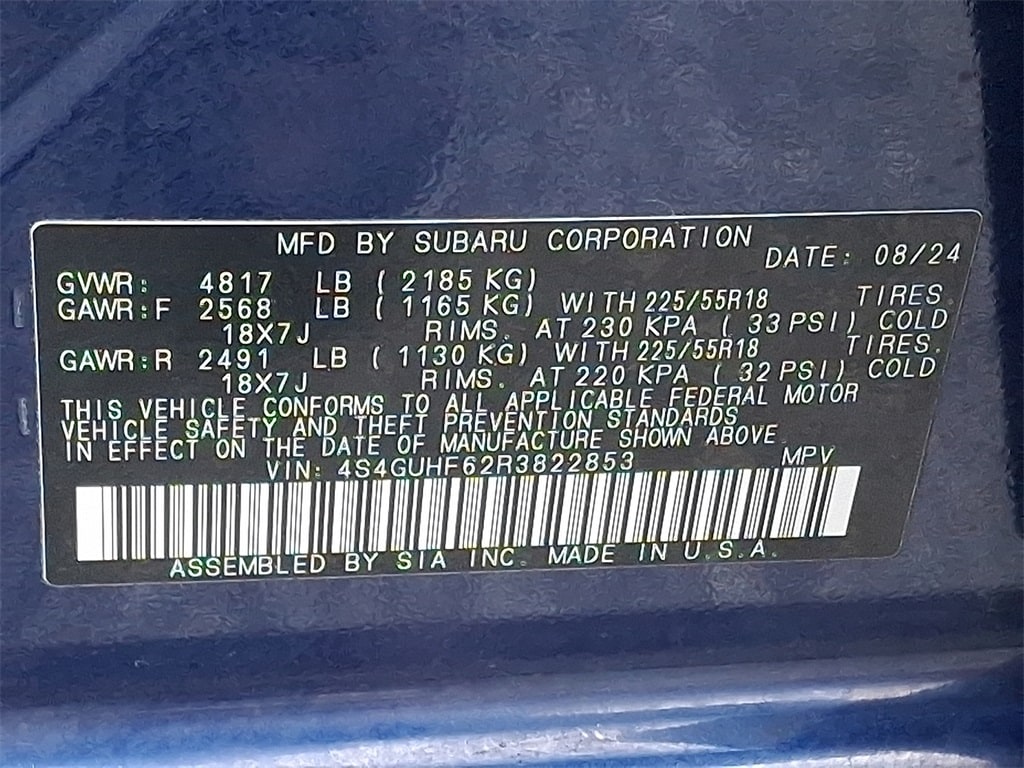 Certified. *SUBARU CERTIFIED*, *NAVIGATION*, *BLUETOOTH*, *HEATED SEATS*, *LEATHER*, *SUNROOF*, *USB*, *SATELLITE RADIO*, *BACK UP CAMERA*, *BLIND SPOT MONITOR*. Check out all these great options BSD/RCTA & Power Driver Seat & Power Moonroof (10-Way Power Driver's Seat, Blind Spot Detection w/Rear Cross-Traffic Alert, and Power Moonroof), Popular Package #4A (All-Weather Floor Liners, Auto-Dimming Exterior Mirror w/Approach Light, Auto-Dimming Mirror w/Compass & HomeLink, Rear Bumper Cover, and Splash Guards), Subaru Certified Pre-Owned Certified, 3.70 Axle Ratio, 4-Wheel Disc Brakes, 6 Speakers, ABS brakes, Air Conditioning, Alloy wheels, AM/FM radio: SiriusXM, Anti-whiplash front head restraints, Auto High-beam Headlights, Automatic temperature control, Brake assist, Bumpers: body-color, Driver door bin, Driver vanity mirror, Dual front impact airbags, Dual front side impact airbags, Electronic Stability Control, Emergency communication system: STARLINK Safety and Security (Subscription Required), Exterior Parking Camera Rear, Four wheel independent suspension, Front anti-roll bar, Front Bucket Seats, Front Center Armrest, Front dual zone A/C, Front fog lights, Front reading lights, Fully automatic headlights, Heated door mirrors, Heated Front Bucket Seats, Heated front seats, Illuminated entry, Knee airbag, Leather Shift Knob, Low tire pressure warning, Occupant sensing airbag, Outside temperature display, Overhead airbag, Overhead console, Panic alarm, Passenger door bin, Passenger vanity mirror, Power door mirrors, Power steering, Power windows, Radio data system, Radio: Subaru STARLINK 11.6" Multimedia Plus Sys, Rear anti-roll bar, Rear seat center armrest, Rear window defroster, Rear window wiper, Remote keyless entry, Security system, Speed control, Speed-sensing steering, Split folding rear seat, Spoiler, Sport Cloth Upholstery, STARLINK/Apple CarPlay/Android Auto, Steering wheel mounted audio controls, Tachometer, Telescoping steering wheel, Tilt steering wheel, Traction control, Trip computer, Turn signal indicator mirrors, Variably intermittent wipers, and Wheels: 18" x 7.0J Dark Gray Aluminum Alloy.