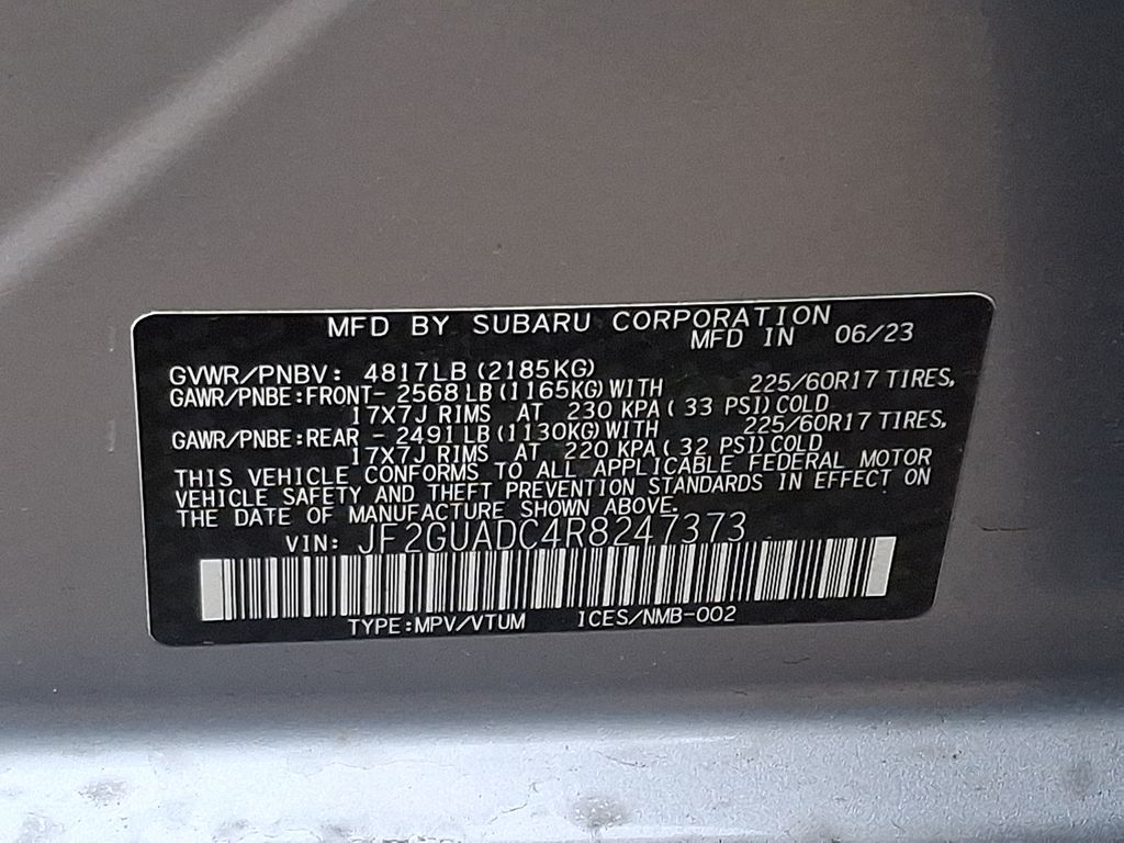 Certified. *SUBARU CERTIFIED*, *BLUETOOTH*, *HEATED SEATS*, *USB*, *SATELLITE RADIO*, *BACK UP CAMERA*, *BLIND SPOT MONITOR*. Check out all these great options Crosstrek Mirror Package (Auto-Dimming Exterior Mirror w/Approach Light and Auto-Dimming Mirror w/Compass & HomeLink), Standard Model, Subaru Certified Pre-Owned Certified, 3.90 Axle Ratio, 4-Wheel Disc Brakes, 6 Speakers, ABS brakes, Air Conditioning, All-Weather Floor Liners, Alloy wheels, AM/FM radio: SiriusXM, Anti-whiplash front head restraints, Auto High-beam Headlights, Automatic temperature control, Brake assist, Bumpers: body-color, Driver door bin, Driver vanity mirror, Dual front impact airbags, Dual front side impact airbags, Electronic Stability Control, Emergency communication system: STARLINK Safety and Security (Subscription Required), Exterior Parking Camera Rear, Four wheel independent suspension, Front anti-roll bar, Front Bucket Seats, Front Center Armrest, Front dual zone A/C, Front fog lights, Front reading lights, Fully automatic headlights, Illuminated entry, Knee airbag, Low tire pressure warning, Occupant sensing airbag, Outside temperature display, Overhead airbag, Overhead console, Panic alarm, Passenger door bin, Passenger vanity mirror, Power door mirrors, Power steering, Power windows, Premium Cloth Upholstery, Radio data system, Radio: Subaru STARLINK 11.6" Multimedia Plus Sys, Rear anti-roll bar, Rear seat center armrest, Rear Seatback Protector, Rear window defroster, Rear window wiper, Remote keyless entry, Security system, Speed control, Speed-sensing steering, Splash Guards, Split folding rear seat, Spoiler, STARLINK/Apple CarPlay/Android Auto, Steering wheel mounted audio controls, Tachometer, Telescoping steering wheel, Tilt steering wheel, Traction control, Trip computer, Turn signal indicator mirrors, Variably intermittent wipers, and Wheels: 17" x 7.0J Dark Gray Aluminum Alloy.