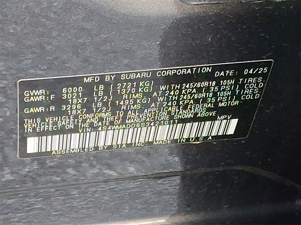 Certified. *SUBARU CERTIFIED*, *BLUETOOTH*, *HEATED SEATS*, *USB*, *SATELLITE RADIO*, *BACK UP CAMERA*, *BLIND SPOT MONITOR*. Check out all these great options Standard Model, Subaru Certified Pre-Owned Certified, 3rd row seats: bench, 4-Wheel Disc Brakes, 6 Speakers, ABS brakes, Air Conditioning, Alloy wheels, AM/FM radio: SiriusXM with 360L, Apple CarPlay & Android Auto, Auto High-beam Headlights, Auto-Dimming Exterior Mirror w/Approach Light, Auto-dimming Rear-View mirror, Automatic temperature control, Brake assist, Bumpers: body-color, Cargo Tray, Compass, Delay-off headlights, Driver door bin, Driver vanity mirror, Dual front impact airbags, Dual front side impact airbags, Electronic Stability Control, Emergency communication system: MySubaru Safety (3-year free trial), Exterior Parking Camera Rear, Four wheel independent suspension, Front anti-roll bar, Front Bucket Seats, Front Center Armrest, Front dual zone A/C, Front reading lights, Fully automatic headlights, Garage door transmitter: HomeLink, Heated door mirrors, Heated Front Bucket Seats, Heated front seats, Illuminated entry, Knee airbag, Leather Shift Knob, Leather steering wheel, LED Upgrade, Low tire pressure warning, Occupant sensing airbag, Outside temperature display, Overhead airbag, Overhead console, Panic alarm, Passenger door bin, Passenger vanity mirror, Power door mirrors, Power driver seat, Power Liftgate, Power steering, Power windows, Radio data system, Radio: Subaru 11.6" Multimedia Plus System, Rear air conditioning, Rear anti-roll bar, Rear Bumper Cover, Rear reading lights, Rear window defroster, Rear window wiper, Reclining 3rd row seat, Remote keyless entry, Security system, Speed control, Speed-sensing steering, Spill Resistant Coated Cloth Upholstery, Splash Guards, Split folding rear seat, Spoiler, Steering wheel mounted audio controls, Tachometer, Telescoping steering wheel, Tilt steering wheel, Traction control, Trip computer, Turn signal indicator mirrors, Variably intermittent wipers, and Wheels: 18" x 7.5 J Gray Alloy w/Machine Finish.